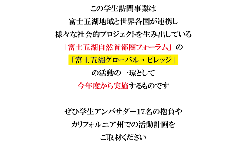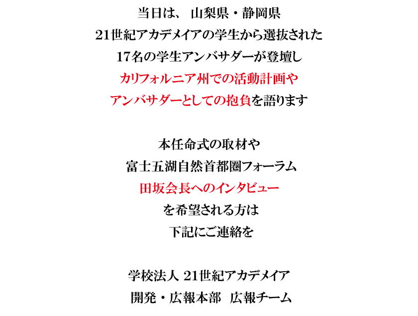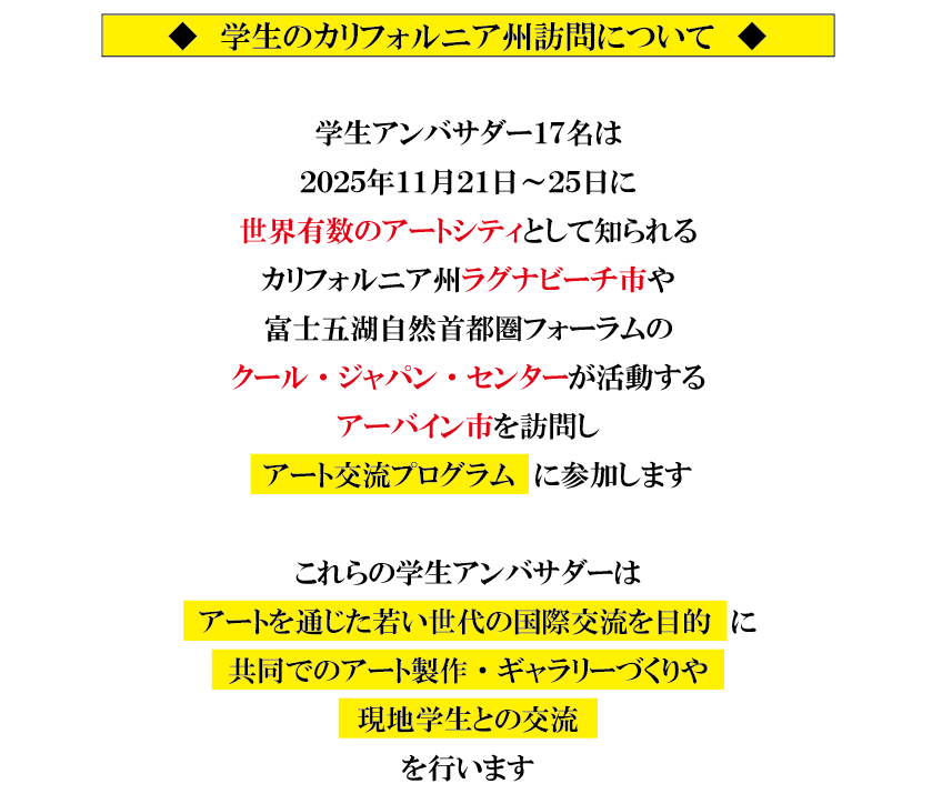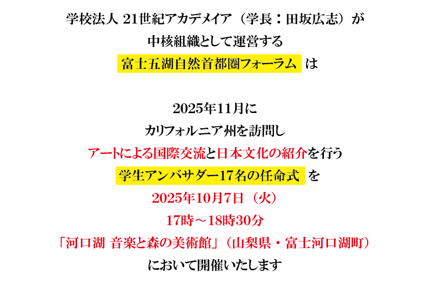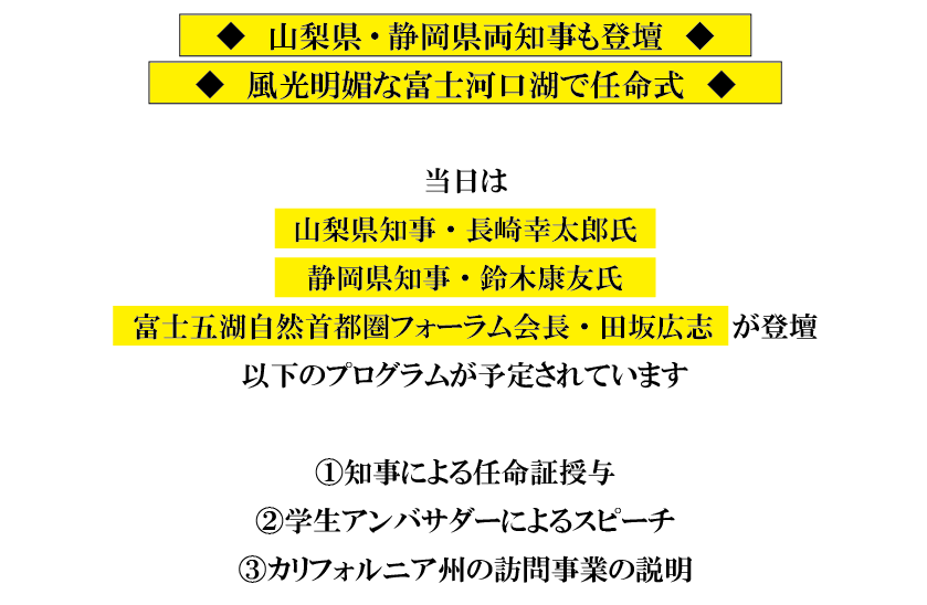 学生が、アートによる国際交流と日本文化の深みを世界に紹介!カリフォルニア州を訪問する学生アンバサダーの任命式を、10月7日、山梨県知事、静岡県知事も登壇して開催